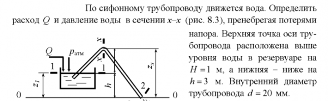 По сифонному трубопроводу движется вода. Определить расход и давление воды в сечении х-х, пренебрегая потерями напора. Верхняя точка оси трубопровода расположена выше уровня воды в резервуаре на 1 м, а нижняя - ниже на 3 м. Внутренний диаметр трубопровода 20 мм.