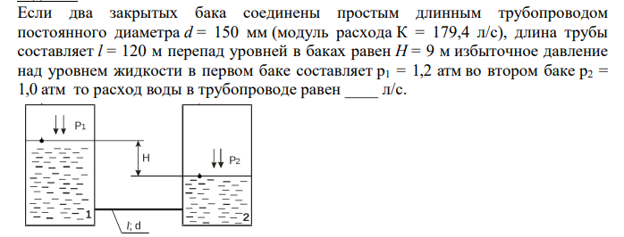Если два закрытых бака соединены простым длинным трубопроводом постоянного диаметра d = 150 мм (модуль расхода К = 179,4 л/с), длина трубы составляет l = 120 м перепад уровней в баках равен H = 9 м избыточное давление над уровнем жидкости в первом баке составляет р1 = 1,2 атм во втором баке р2 = 1,0 атм то расход воды в трубопроводе равен