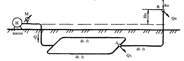 От насосной установки по трубопроводной системе с параллельным соединением труб вода подается двум потребителям – А и В - с расходами QA = 15 л/с; QB = 18 л/с. Длины и диаметры участков системы: d1 = 100 мм, l1 = 500 м; d2 = 125 мм, l2 = 700 м; d3 = 125 мм, l3 = 600 м. Высота подъёма воды у потребителя BHB = 8 м, а остаточный напор hВ = 15 м. Определить распределение расходов в параллельных участках труб, а также показание манометра, установленного после насоса (рман). Местные сопротивления принять равными 5 % от потерь по длине. Считать, что трубы водопроводные нормальные, уложенные горизонтально.