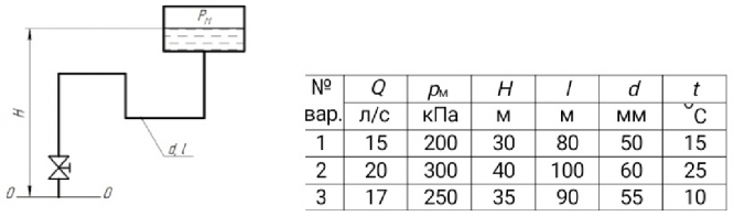 Главная » Учебные материалы » Гидрогазодинамика (ГГД) » Решения задач » СибАДИ » Несколько классов/семестров » Номер 1.29 » Вариант 1 » Нефть при температуре t °C подается в резервуар на высоту Н по трубопроводу с расходом Q. Диаметр трубопровода d, длина l, шероховатость kэ=0,04 мм. Избыточное давление в резервуаре рм. Определить потребный напор в сечении 0-0.