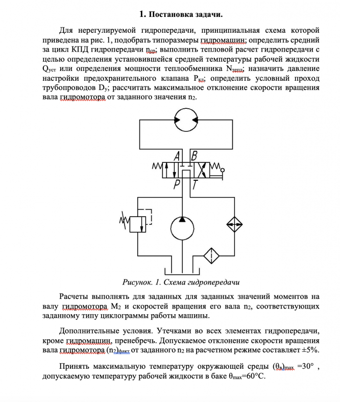 Для нерегулируемой гидропередачи, принципиальная схема которой приведена на рис. 1, подобрать типоразмеры гидромашин; определить средний за цикл КПД гидропередачи ɳср; выполнить тепловой расчет гидропередачи с целью определения установившейся средней температуры рабочей жидкости уст или определения мощности теплообменника тепл; назначить давление настройки предохранительного клапана кл; определить условий проход трубопроводов у ; рассчитать максимальное отклонение скорости вращения вала гидромотора от заданного значения.