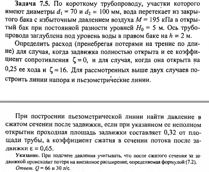 Для студентов МГТУ им. Н.Э.Баумана по предмету ГидромеханикаЗадача 7.5Задача 7.5