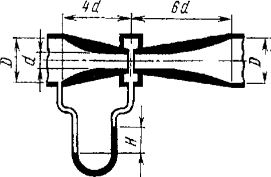 Расход пресной воды плотностью ρв=1000 кг/м3 в трубопроводе измеряется при помощи расходомера Вентури (рис. 6.5). Определить расход воды Q, если показание присоединенного к нему ртутного дифманометра Н=0,5 м, а диаметры широкой и суженной частей расходомера D=0,1 м и d=0,06 м. Плотность ртути ρрт=13550 кг/м3.