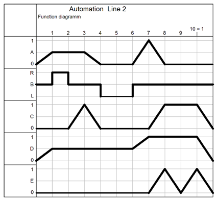 Согласно заданной диаграммы «перемещение-шаг» разработать релейно-контактную схему управления (а также, используя, симулятор контроллера в программе FluidSim-H) гидроприводом, состоящим из четырех гидроцилиндров и одного гидромотора (В).