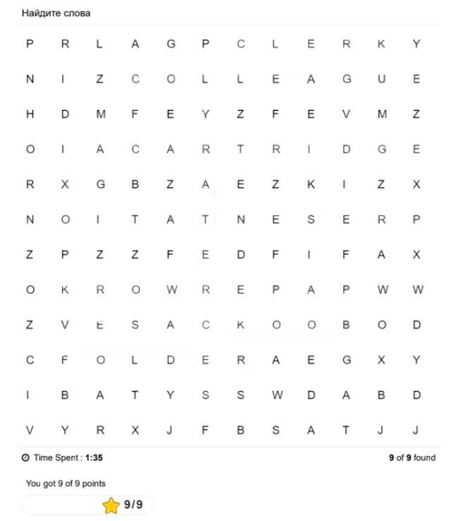 Решите филворд. Найдите 9 слов, связанных с работой в офисе (должность/название профессии, сфера деятельности, материалы и оборудование и проч.)..