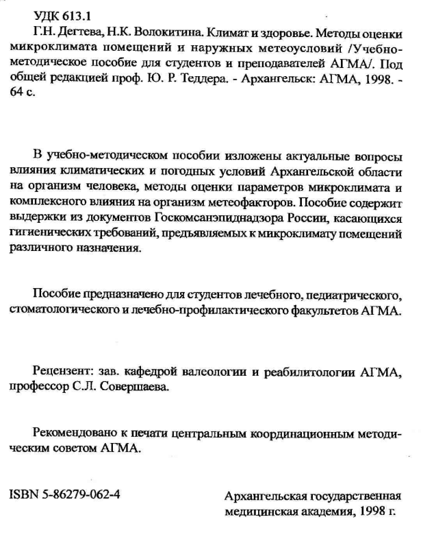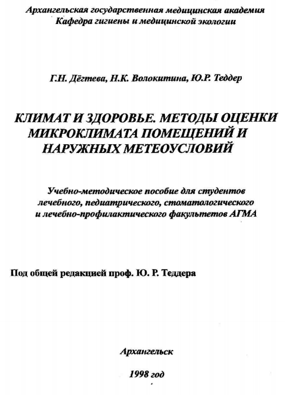 Для студентов СГМУ по предмету ГигиенаМП- Климат и здоровье, методы оценки микроклимата помещений и наружных метеоусловий. Ю.Р. Теддер, Г.Н. Дегтева, Н.К. Волокитина 1998г.МП- Климат и здоровье, методы оценки микроклимата помещений и наружных метеоусловий. Ю.Р. Теддер, Г.Н. Дегтева, Н.К. Волокитина 1998г.