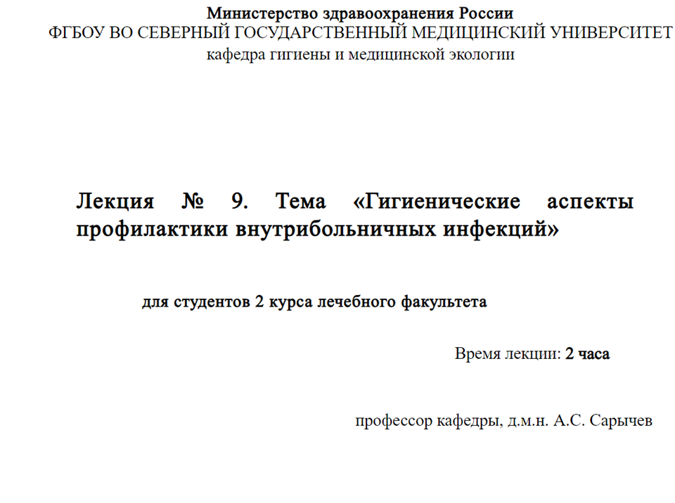 Для студентов СГМУ по предмету ГигиенаЛекция №9. Гигиенические аспекты профилактики внутрибольничных инфекций. А.С Сарычев 2021Лекция №9. Гигиенические аспекты профилактики внутрибольничных инфекций. А.С Сарычев 2021