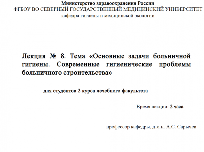Для студентов СГМУ по предмету ГигиенаЛекция№8. Основные задачи больничной гигиены. Современные гигиенические проблемы больничного строительства. Сарычев А.С. 2021Лекция№8. Основные задачи больничной гигиены. Современные гигиенические проблемы больничного строительства. Сарычев А.С. 2021