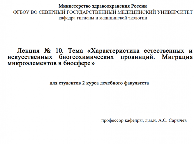 Для студентов СГМУ по предмету ГигиенаЛекция № 10. Характеристика естественных и искусственных биогеохимических провинций. Миграция микроэлементов в биосфере. Сарычев А.С. 2021Лекция № 10. Характеристика естественных и искусственных биогеохимических провинций. Миграция микроэлементов в биосфере. Сарычев А.С. 2021