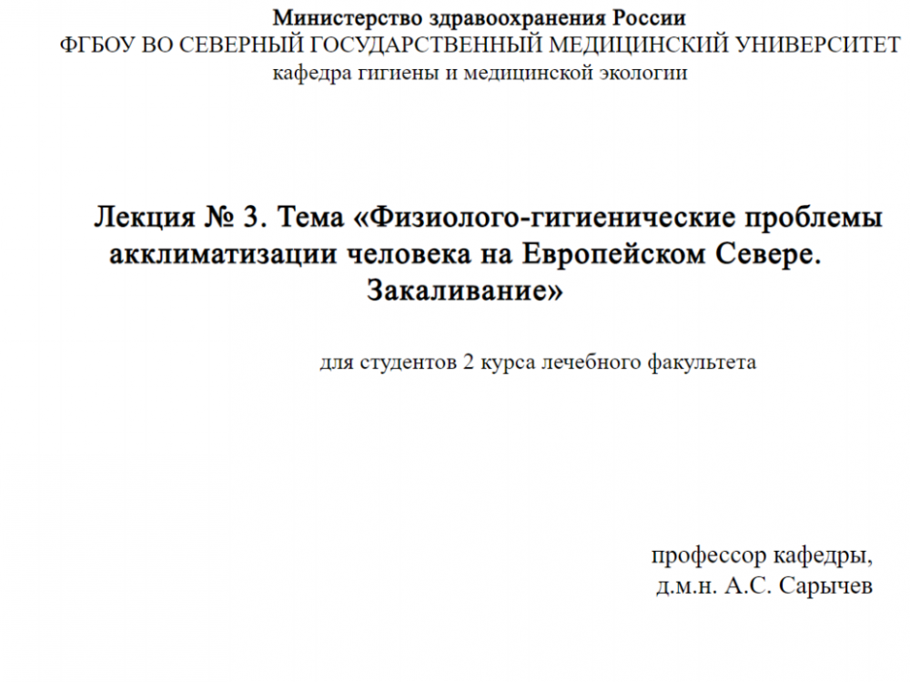Для студентов СГМУ по предмету ГигиенаЛекция №3. Физиолого-гигиенические проблемы акклиматизации человека на Европейском Севере. Закаливание. А.С. Сарычев 2020Лекция №3. Физиолого-гигиенические проблемы акклиматизации человека на Европейском Севере. Закаливание. А.С. Сарычев 2020