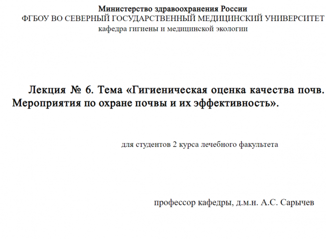 Для студентов СГМУ по предмету ГигиенаЛекция №6. Гигиеническая оценка качества почв. Мероприятия по охране почвы и их эффективность А.С. Сарычев 2020Лекция №6. Гигиеническая оценка качества почв. Мероприятия по охране почвы и их эффективность А.С. Сарычев 2020