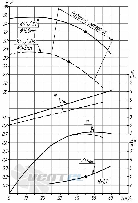 Центробежный консольный насос К45/30, характеристика которого приведена на рис. 1, работает на сеть трубопроводов. Высота подачи воды h. Характеристика сети выражается уравнением H = h + k · Q2 (где Q в м3/ч). Определить: насколько увеличиться напор в сети при параллельном включении еще одного такого же насоса. Дано: Dк=168 мм; h=26 м; k=0,0044.