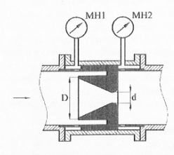 Каким должен быть расход воды в модели Q1 для соблюдения условий подобия (Re1 = Re2), если расход масла (ρ2 = 890 кг/м3, ν2 = 10 мм2/с) Q2? Какими будут потери давления на сужающем устройстве в натуре, если показания манометров на модели МН1, МН2 ?