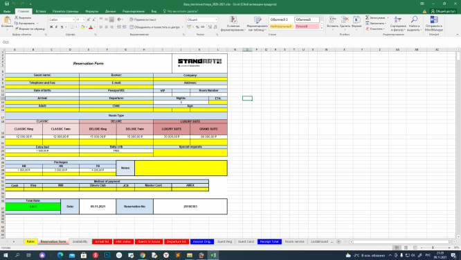 Примерная база отеля для отработок различных ситуаций, которые могут попасться на демонстрационном экзамене по стандартам Word Skills. Внутри много вкладок с различными формулами, такими как: Rates, Reservation Form, Availability, Arrival list, HSK status и еще множество форм, которые могут попасться на экзамене! База примерная, каждый год её немного меняют, но основа всегда остается той же. Благодаря этой базе легче готовиться и сдать экзамен на высший балл. ![]()