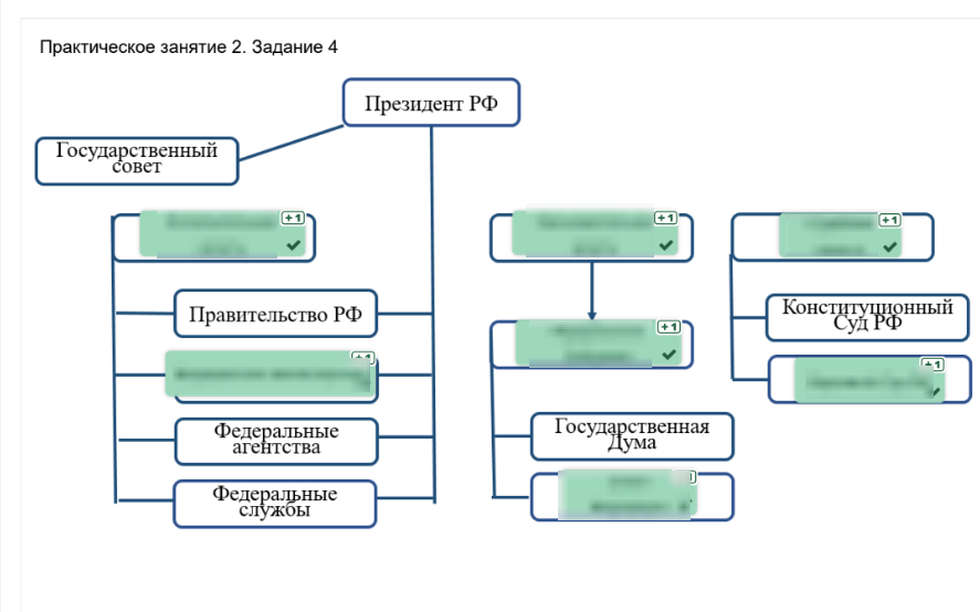 Заполните недостающие элементы в схеме «Виды высших государственных органов РФ», переместив блоки с названиями высших государственных органов в пустующие ячейки схемы. Обратите внимание, что задание содержит фальшответы (неправильные названия высших государственных органов). Для выполнения задания используйте левую кнопку компьютерной мыши. .