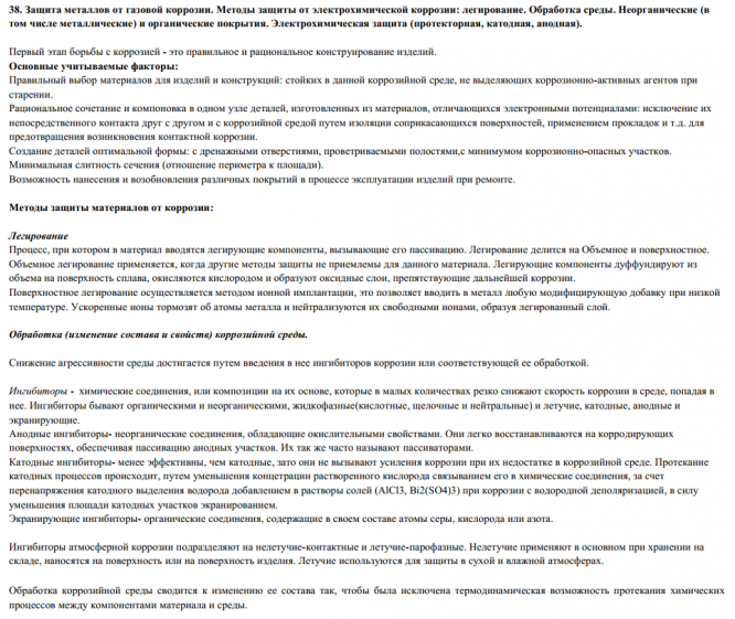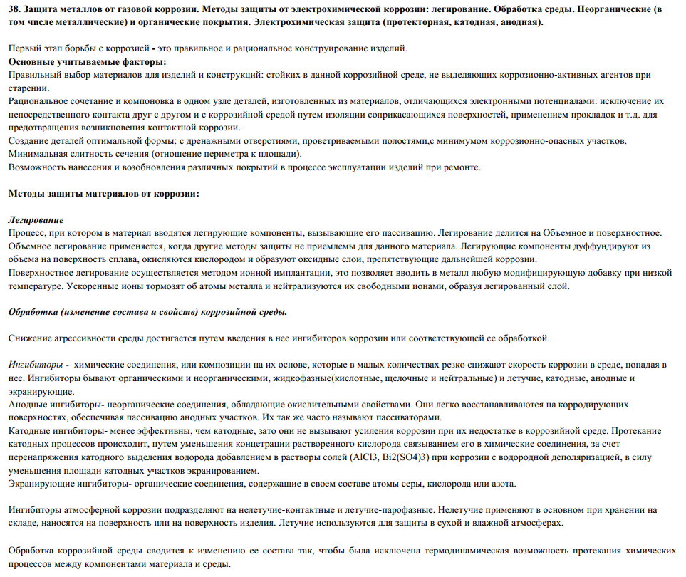 - Защита металлов от газовой коррозии. Методы защиты от электрохимической коррозии: легирование. Обработка среды. Неорганические (в том числе металлические) и органические покрытия. Электрохимическая защита (протекторная, катодная, анодная).