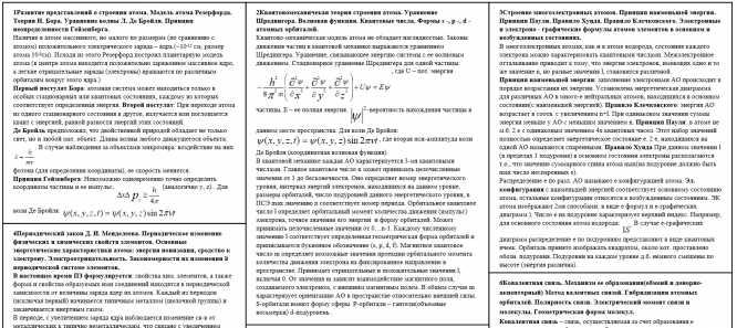 Развитие представлений о строении атома. Модель атома Резерфорда. Теория Н. Бора. Уравнение волны Л.Де Бройля. Принцип неопределенности Гейзенберга. Квантовомеханичекая теория строения атома. Уравнение Шредингера. Волновая функция. Квантовые числа. Формы s -, p -, d - атомных орбиталей. Строение многоэлектронных атомов. Принцип наименьшей энергии. Принцип Паули. Правило Хунда. Правило Клечковского. Электронные и электронно-графические формулы атомов элементов в основном и возбужденных состояниях. Периодический закон Д. И. Менделеева. Периодическое изменение физических и химических свойств элементов. Основные характеристики атома: энергия ионизации, сродство к электрону,электроотрицательность, радиус атома.