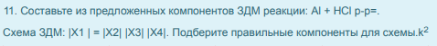 11. Составьте из предложенных компонентов ЗДМ реакции: Al + HCl р-р=. Схема ЗДМ: |X1 | = |X2| |X3| |X4|. Подберите правильные компоненты для схемы