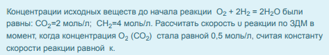 Концентрации исходных веществ до начала реакции О + 2Н = 2НО были равны: СО =2 моль/л; СН =4 моль/л. Рассчитать скорость υ реакции по ЗДМ в момент, когда концентрация О (СО ) стала равной 0,5 моль/л, считая константу скорости реакции равной к.