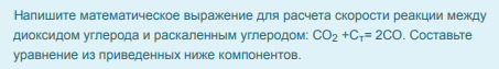 Напишите математическое выражение для расчета скорости реакции между диоксидом углерода и раскаленным углеродом: СО +С = 2СО. Составьте уравнение из приведенных ниже компонентов.
