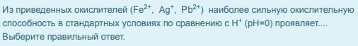 Из приведенных окислителей (Fe , Ag , Pb ) наиболее сильную окислительную способность в стандартных условиях по сравнению с Н (рН=0) проявляет.... Выберите правильный ответ.