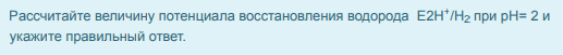 Рассчитайте величину потенциала восстановления водорода Е2Н /Н при рН= 2 и укажите правильный ответ.