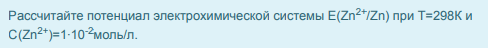 Рассчитайте потенциал электрохимической системы Е(Zn /Zn) при Т=298К и С(Zn )=1∙10 моль/л.