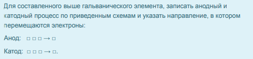 Для составленного выше гальванического элемента, записать анодный и катодный процесс по приведенным схемам и указать направление, в котором перемещаются электроны: