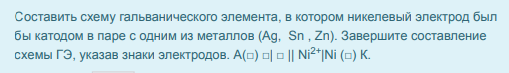 Составить схему гальванического элемента, в котором никелевый электрод был бы катодом в паре с одним из металлов (Ag, Sn , Zn). Завершите составление схемы ГЭ, указав знаки электродов