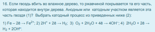 16. Если гвоздь вбить во влажное дерево, то ржавчиной покрывается та его часть, которая находится внутри дерева. Анодным или катодным участком является эта часть гвоздя (1)? Выбрать катодный процесс из приведенных ниже (2):