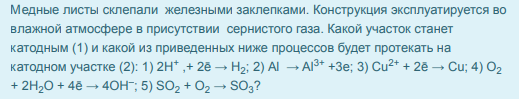 Медные листы склепали железными заклепками. Конструкция эксплуатируется во влажной атмосфере в присутствии сернистого газа. Какой участок станет катодным (1) и какой из приведенных ниже процессов будет протекать на катодном участке (2):