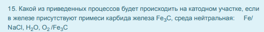 15. Какой из приведенных процессов будет происходить на катодном участке, если в железе присутствуют примеси карбида железа Fe C, среда нейтральная: Fe/ NaCl, H O, O /Fe C