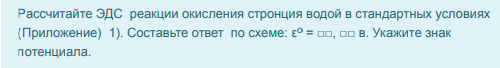 Рассчитайте ЭДС реакции окисления стронция водой в стандартных условиях (Приложение) 1). Составьте ответ по схеме. Укажите знак потенциала
