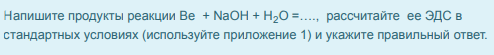 Напишите продукты реакции Вe + NaOH + H O =…., рассчитайте ее ЭДС в стандартных условиях (используйте приложение 1) и укажите правильный ответ.