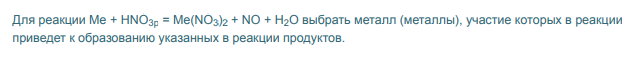 Для реакции Me + HNO = Me(NO3)2 + NO + H2O выбрать металл (металлы), участие которых в реакции приведет к образованию указанных в реакции продуктов