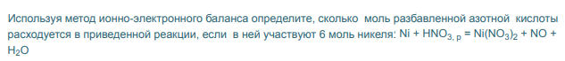 Используя метод ионно-электронного баланса определите, сколько моль разбавленной азотной кислоты расходуется в приведенной реакции, если в ней участвуют 6 моль никеля