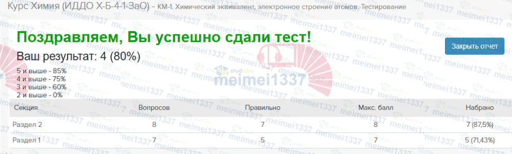 Курс Химия - КМ-1. Химический эквивалент, электронное строение атомов. Тестирование - 80%