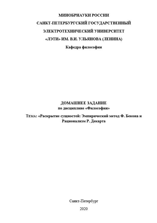 Для студентов СПбГЭТУ им. Ульянова (Ленина) по предмету ХимияРаскрытие сущностей: Эмпирический метод Ф. Бекона и Рационализм Р. ДекартаРаскрытие сущностей: Эмпирический метод Ф. Бекона и Рационализм Р. Декарта