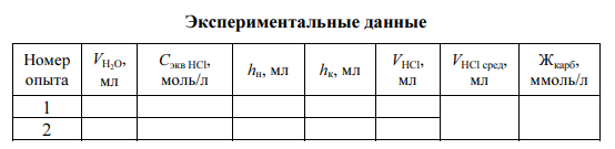 В две одинаковые (мерные) колбы налейте 100 мл холодной водопроводной воды до соответствующей метки. В каждую колбу добавьте две капли индикатора метилового оранжевого. Исходный раствор приобретает желтую окраску, что соответствует щелочной среде. В первую пробу воды при постоянном перемешивании, предварительно записав положение начального уровня жидкости в бюретке, прибавляйте из бюретки по каплям соляную кислоту до изменения окраски раствора в колбе от желтого до оранжевого. Появление розовой окраски указывает на избыток кислоты в растворе, т. е. перетитрование раствора. Разность уровней до и после титрования определяет объем израсходованной кислоты (положения уровней раствора в бюретке определяют объемы, поскольку сечение бюретки равно 1 см2 ). Проделайте аналогичный опыт, используя вторую пробу воды. Возьмите среднее арифметическое значение из двух опытов. Внесите экспериментальные данные в табл. 4.1, рассчитайте значение карбонатной жесткости воды по уравнению (4.1). Суммарное уравнение реакции, протекающей при титровании воды раствором соляной кислоты: (НСОЗ) − + Н+ → Н2О + СО2↑ Если жесткость воды определяется только ионами кальция, то уравнение реакции можно записать в виде Са(НСОЗ)2 + 2НСl → CaCl2 + 2Н2О + 2СО2↑