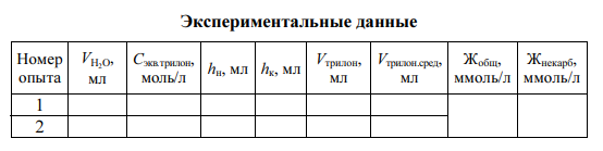 В две одинаковые мерные колбы налейте 100 мл холодной водопроводной воды до метки, в каждую добавьте по 5 мл буферного раствора и на кончике шпателя небольшое количество твердого индикатора эриохрома черного. Исходный раствор приобретает винно-красную окраску. Общую жесткость определяют титрованием пробы раствором трилона Б. Аналогично опыту 1 в каждую пробу воды при постоянном перемешивании прибавляйте из бюретки, предварительно записав положение начального уровня жидкости в бюретке, раствор Трилона Б. Титрование проводите медленно, наблюдая за переходом окраски от винно-красной сначала в фиолетовую, а затем в сине-голубую. Перетитрованный раствор также имеет синеголубую окраску. Разность уровней до и после титрования определяет объем израсходованного Трилона Б. Проделайте аналогичный опыт, используя вторую пробу воды. Возьмите среднеарифметическое значение из двух опытов. Внесите экспериментальные данные в табл. 4.2, рассчитайте значение общей и постоянной (некарбонатной) жесткости воды, используя уравнения (4.1) и (4.2).
