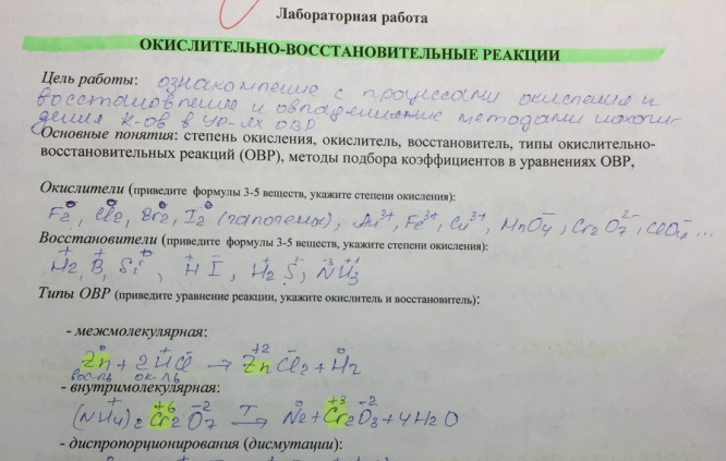 Цель работы — ознакомление с процессами окисления и восстановления и овладение методами нахождения коэффициентов в уравнениях окислительно-восстановительных реакций.