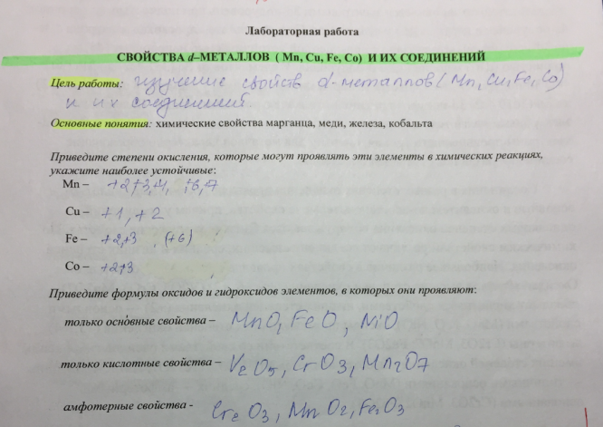 Цель работы — изучение свойств d-металлов (Mn, Cu, Fe, Со) и их соединений.Практическая часть