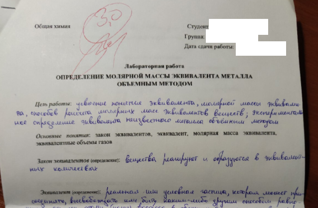 Зачтенная на максимальный балл лабораторная работа по химии "Определение молярной массы эквивалента металла объемным методом", заполнены все части, + доп теория, + доп задача от преподавателя,1 семестр, для всех факультетов