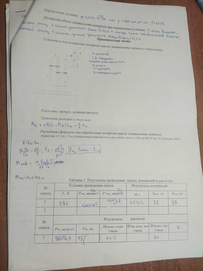 Главная » Учебные материалы » Химия » Лабораторные работы » МГТУ им. Н.Э.Баумана » Несколько классов/семестров » Номер 2 » Определение молярной массы эквивалента металла объемным методом