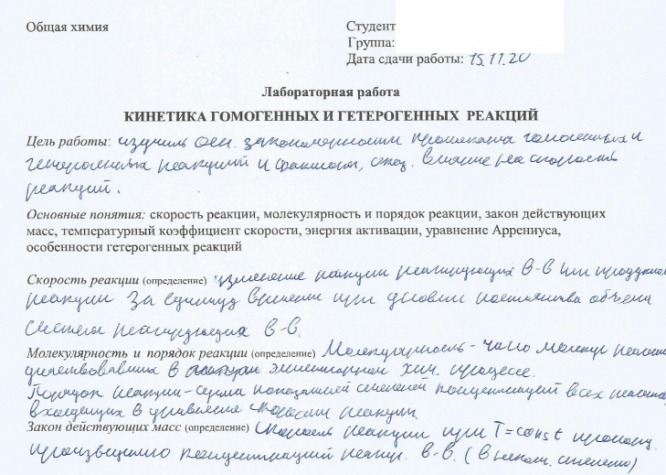 Зачтенная на максимальный балл лабораторная работа по химии "Кинетика гомогенных и гетерогенных реакций", 1, 2 семестры, для всех факультетов
