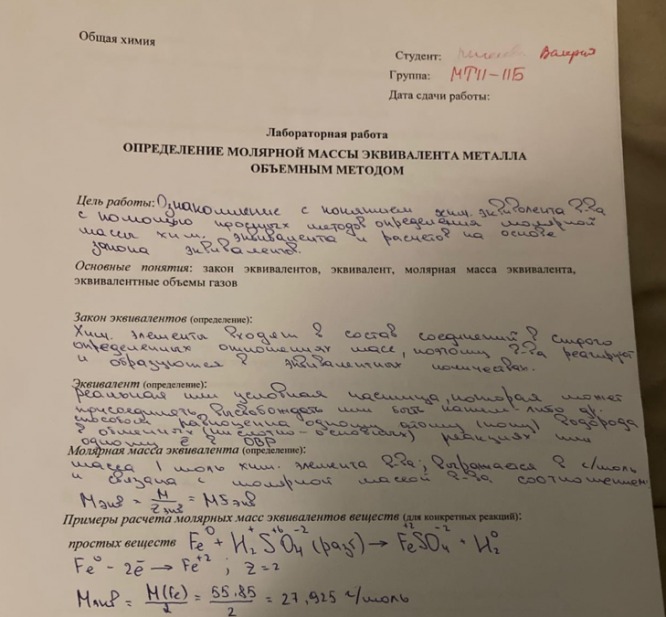 Зачтенная на максимальный балл лабораторная работа по химии "Определение молярной массы эквивалента металла объемным методом", 1 и 2 семестры, для всех факультетов