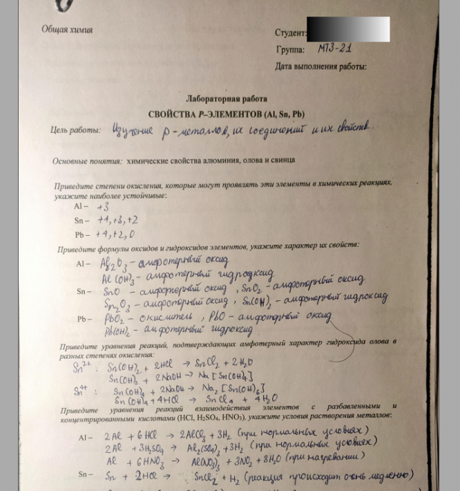 Лабораторная работа 6: Химические свойства p-элементов (Al,Sn,Pb)