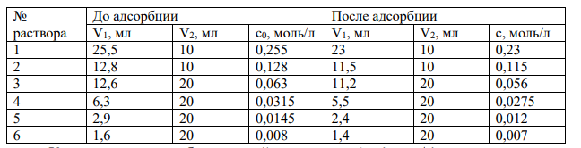 Цель работы: количественное определение адсорбции уксусной кислоты на угле, построение изотермы адсорбции и определение констант уравнения Фрейндлиха.