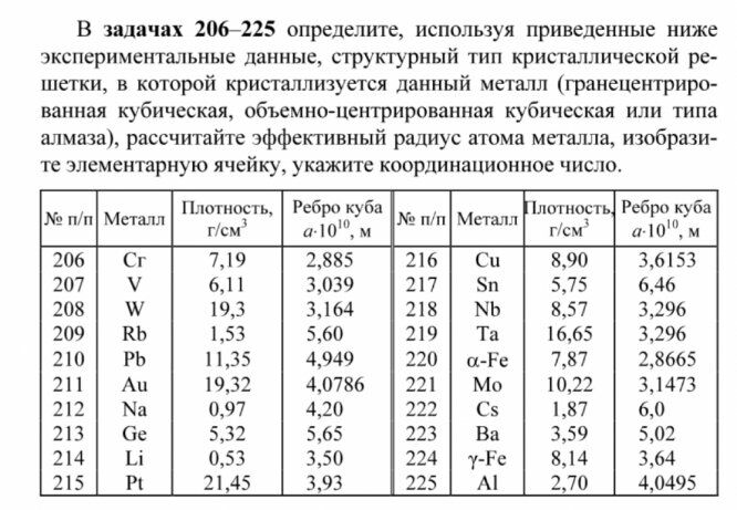Задача 213 - определите, используя приведенные ниже экспериментальные данные, структурный тип кристаллической решетки, в которой кристаллизуется данный металл (гранецентрированная кубическая, объемно-центрированная кубическая или типа алмаза), рассчи