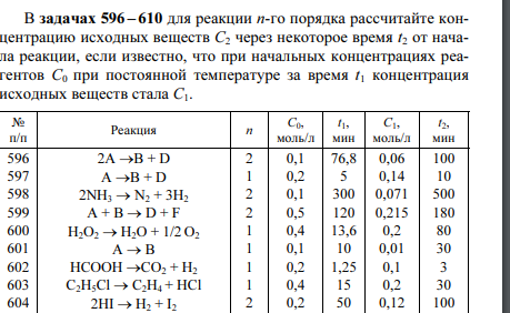 598 0 для реакции n-го порядка рассчитайте концентрацию исходных веществ С2 через некоторое время t2 от начала реакции, если известно, что при начальных концентрациях реагентов С0 при постоянной температуре за время t1 концентрация исходных веществ с